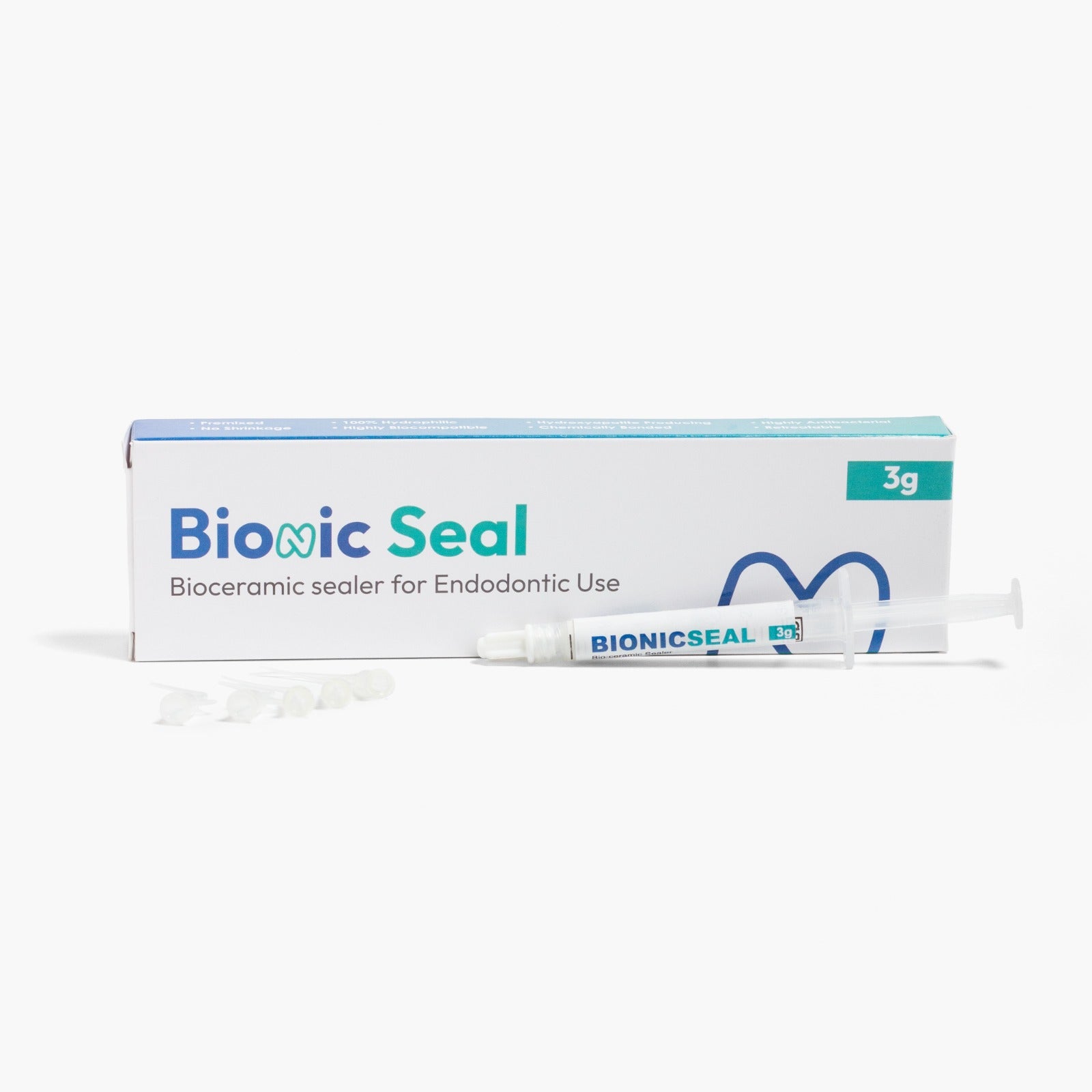 • Can be used in single cone technique and sealing without cone also - Directions to Use: Bionic Seal is supplied as a premixed paste in a preloaded syringe with disposable intracanal plastic flexible tips. Prior to the application of the material, the prepared root canal dried using a paper point but don't dry it completely as the material sets with moisture.