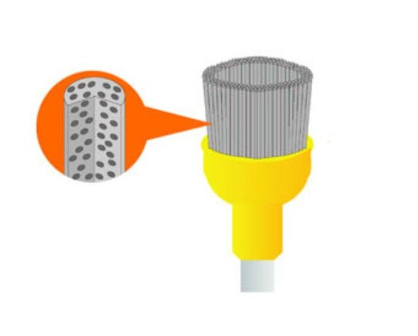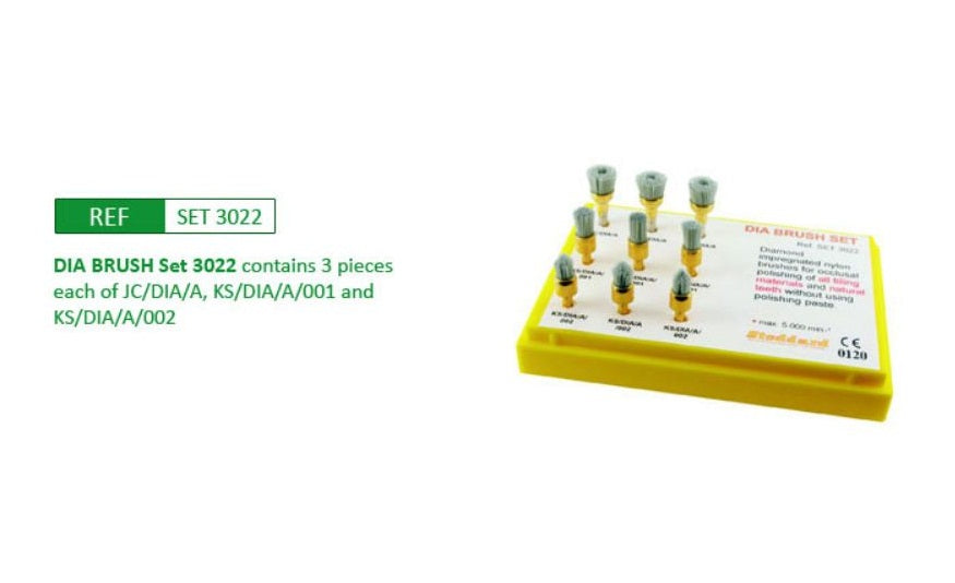 Stoddard DIA brush provides a single step. fast effective end economical polishing system for all kinds of restorative materials and natural teeth. Polishing paste is not necessary as the special filaments are loaded with fine diamond polishing particles for an exceptionally high lustre finish. As the brushes wear, diamond grit is consistently exposed on each filament at the polishing surface.