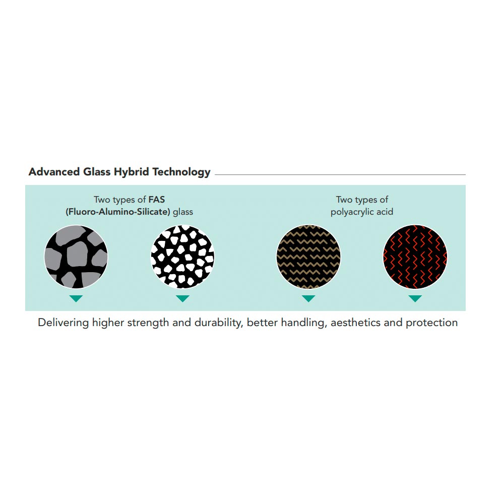 GC Gold Label Hybrid is a hand-mixed, self-adhesive glass ionomer restorative formulated for posterior applications. Powered by GC’s Advanced Glass Hybrid Technology, it combines two types of Fluoro-Alumino-Silicate (FAS) glass and two types of polyacrylic acid to deliver improved strength, acid resistance, and clinical handling.