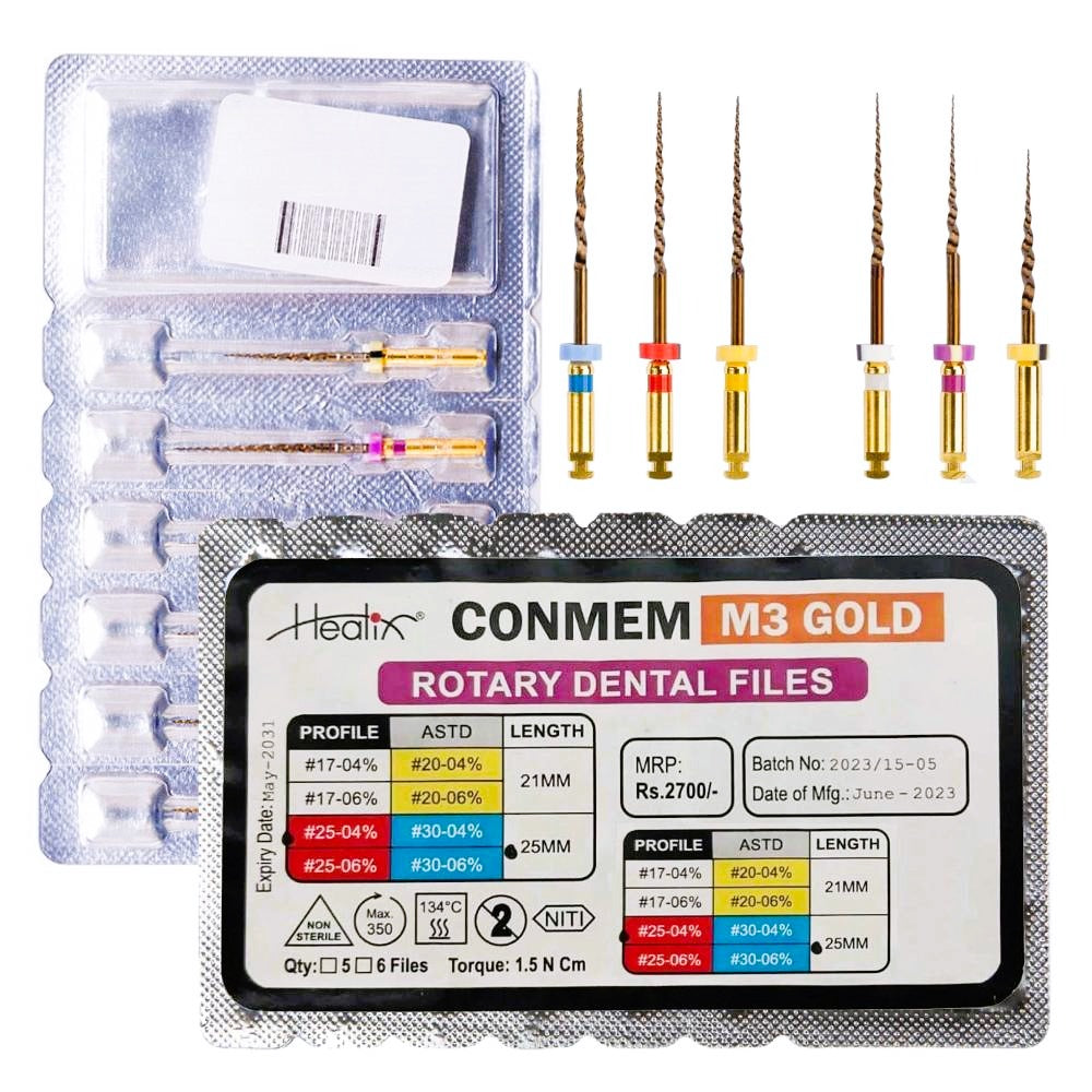 Healix Conmem M3 Gold Rotary Files are heat-treated nickel-titanium endodontic files manufactured in India, engineered using Control Memory (Conmem) wire technology. This design enables excellent flexibility and navigation through complex canal anatomies, including severely curved and narrow canals.