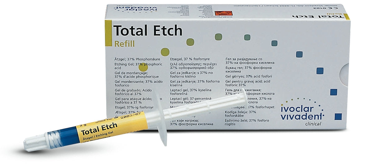 Total Etch is an etching gel containing 37% phosphoric acid. Total Etch is used for enamel etching and dentin conditioning in conjunction with sealants, composite restorations and the adhesive luting of indirect all-ceramic or composite restorations.