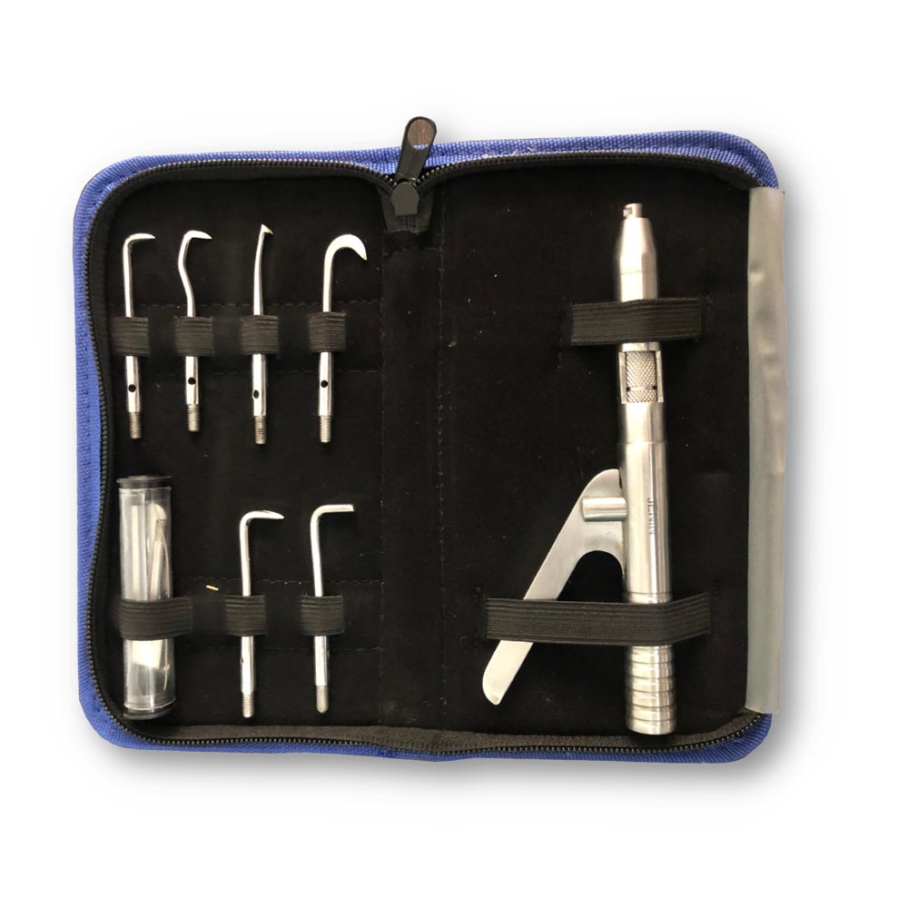 JENIN Crown Remover Kit is a spring-loaded mechanical tool designed to assist in the removal of bonded crowns and bridges through controlled impulse force. This gun-type remover includes six interchangeable tips, a wrench, and a swivel lock key. The device offers adjustable impulse strength, allowing for more careful application—especially important for root-treated teeth.