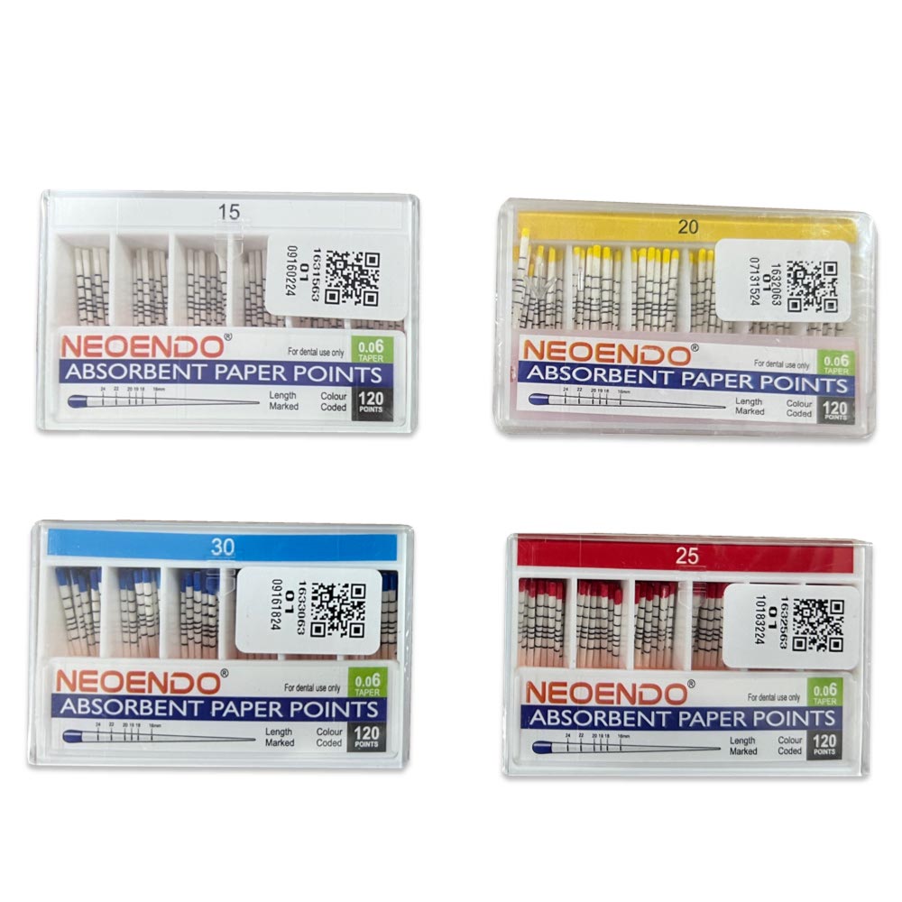 NEOENDO 6% Absorbent Paper Points are designed for reliable canal drying during endodontic procedures. Hand-rolled for uniformity, these points combine strong absorbency with structural firmness to reduce bending or collapse during placement.