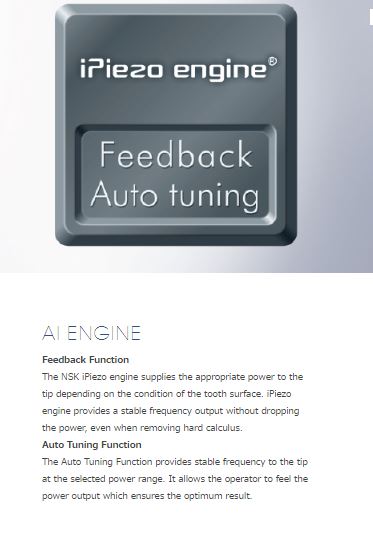 Varios 370 by NSK features the intuitive NSK iPiezo engine offering you more effective and efficient treatment in all clinical applications. It has been especially developed to offer a compact, portable control unit allowing easy installation into any dental unit. It is simple to operate and suitable for a variety of clinical procedures. Twin LED lights at the head of the slim-line handpieces ensures much clearer vision and allows for easier identification of calculus and plaque during oral hygiene and scaling procedures. Handpiece is washable in the thermodisinfector and autoclavable up to 135ºC.