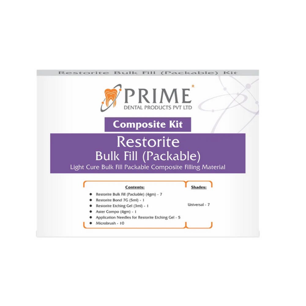 Prime Dental Restorite Bulk Fill Packable Kit offers a complete solution for durable and efficient posterior restorations. This kit features a packable bulk fill composite designed for single-layer application up to 4mm, streamlining the restorative process while maintaining excellent physical properties. Its firm consistency ensures easy adaptation, shaping, and placement in posterior cavities, while the low-shrinkage formulation supports superior marginal integrity and long-term reliability.