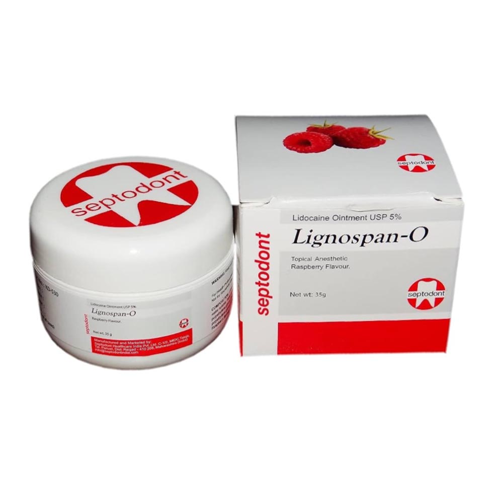Septodont Lignospan-O is a topical amide-based anaesthetic ointment formulated to provide temporary pain relief and improve patient comfort during dental procedures. It works by blocking sodium ion channels, thereby inhibiting nerve signal transmission and producing localized numbness.