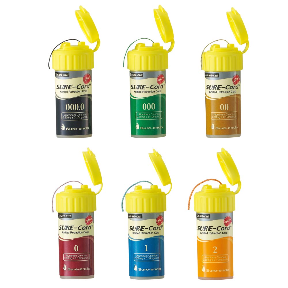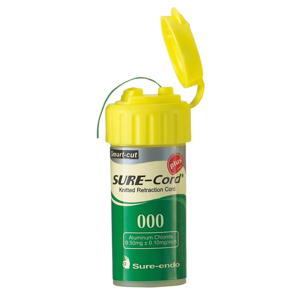 Sure-Endo SURE-Cord Plus is a knitted retraction cord made from split microfiber, offering higher absorbency than traditional cotton cords. It is impregnated with aluminum chloride to help reduce fluid in the gingival sulcus and assist in minor bleeding control.