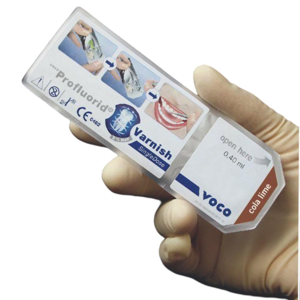 This varnish adheres well to moist surfaces and sets quickly upon contact with saliva, making it suitable for chairside application without the need for additional equipment. It also contributes to long-term protection by supporting the formation of fluorapatite, which enhances the tooth’s resistance to acidic challenges. Xylitol is included for its cariostatic properties and to improve taste, while the formula is free from saccharin, aspartame, and gluten.
