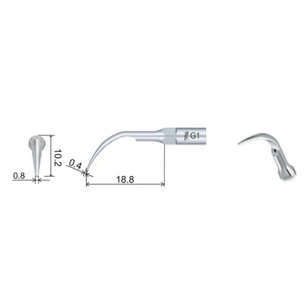 Woodpecker G1 Scaler Tip is designed for use with UDS and EMS-compatible ultrasonic scalers. It is intended for the removal of supragingival calculus and plaque, particularly on the cervical areas of molars and anterior teeth. The tip features a flat working end that allows effective contact with the tooth surface, aiding in the efficient management of deposits across all quadrants. Constructed from high-grade stainless steel alloy, it offers durability and is fully autoclavable for repeated clinical use. The slender, curved design supports precise adaptation during scaling procedures.